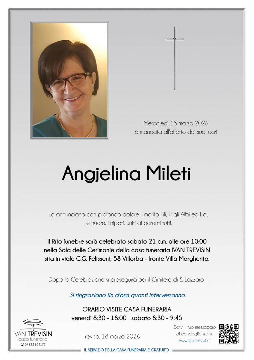Lascia gratuitamente un messaggio di cordoglio, sarà nostra cura consegnarlo ai congiunti di Angjelina Mileti.