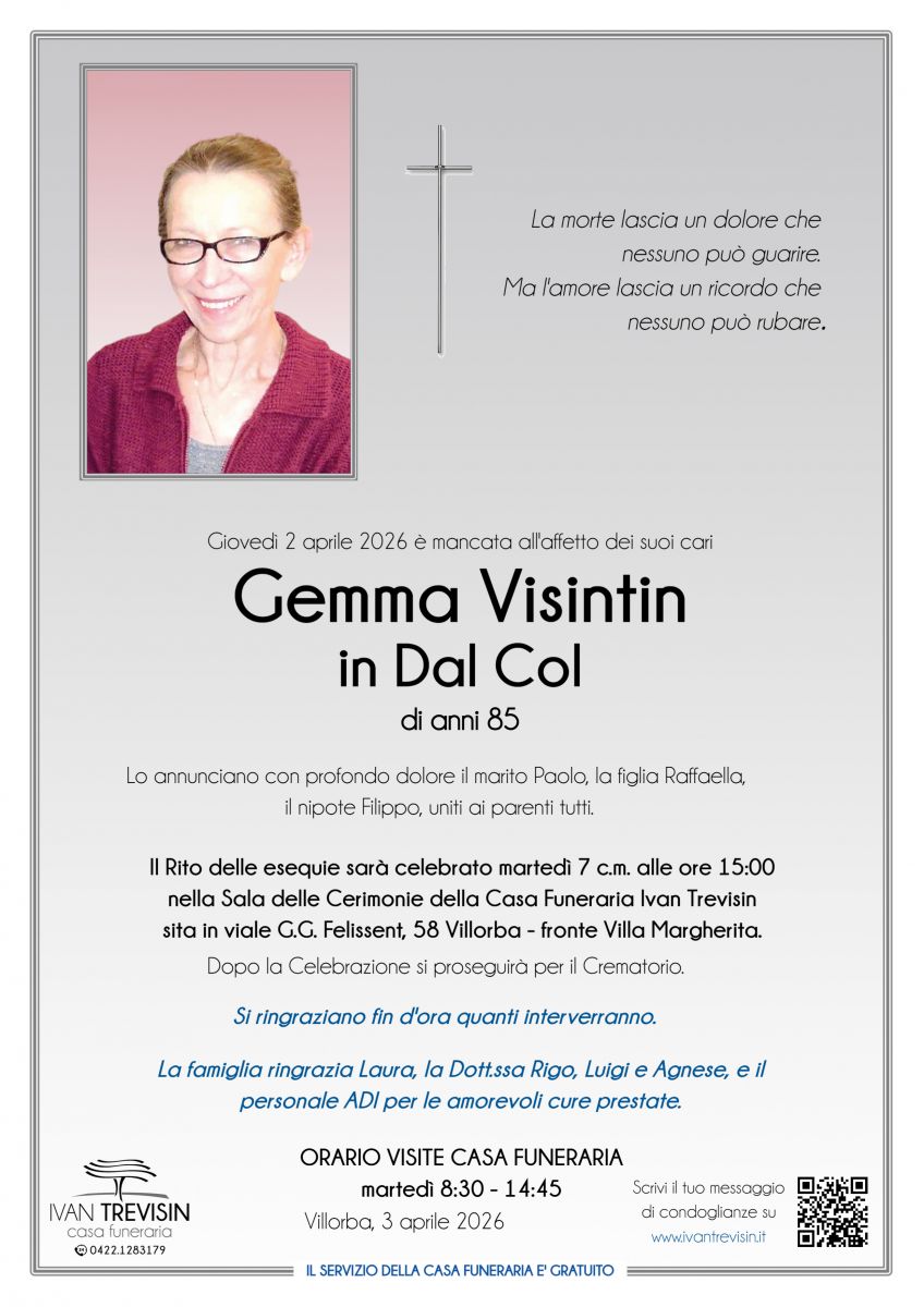Lascia gratuitamente un messaggio di cordoglio, sarà nostra cura consegnarlo ai congiunti di Gemma Visintin.