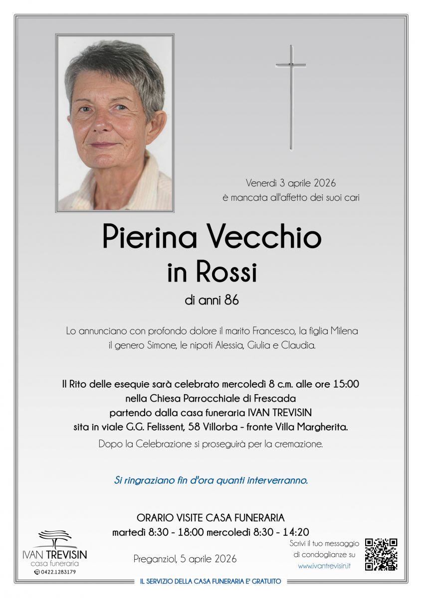 Lascia gratuitamente un messaggio di cordoglio, sarà nostra cura consegnarlo ai congiunti di Pierina Vecchio.