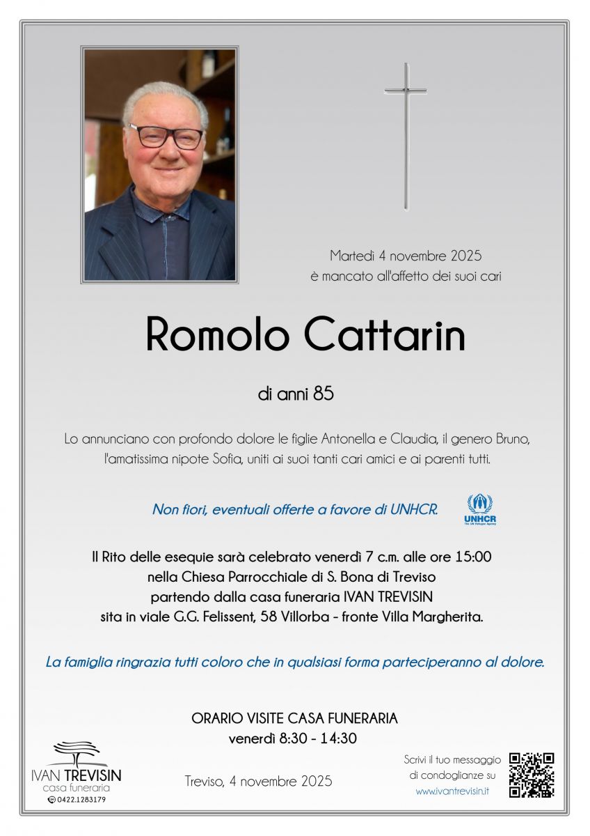 Lascia gratuitamente un messaggio di cordoglio, sarà nostra cura consegnarlo ai congiunti di Romolo Cattarin.